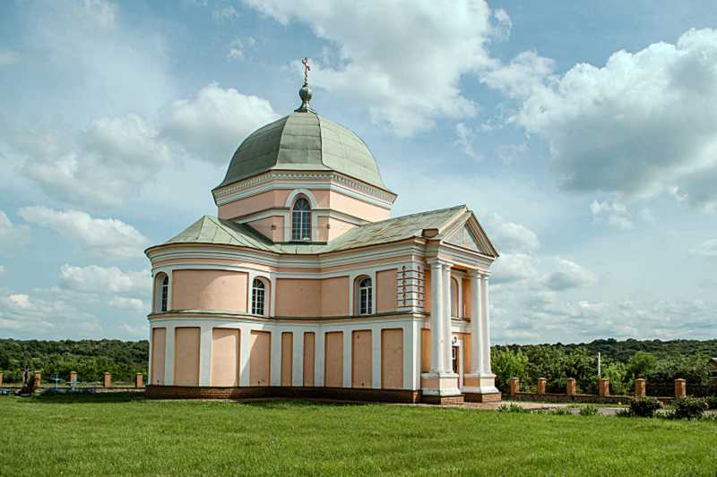 ЦЕРКОВЬ, середина XIX в. Кирпичная, крестовая в плане однокупольная. Фасады памятника в стиле позднего классицизма разделены по вертикали на два яруса. Первый имеет горизонтальный руст и расчленен лопатками до уровня подоконного пояса. Второй – несет окна с простыми наличниками, которые упираются в горизонтальную тягу, проходящую на уровне антаблемента. Особое внимание уделено западному входу, который украшен пристенным четырехколонным портиком из спаренных колонн полного тосканского ордера и завершен треугольным фронтоном. [Памятники градостроительства и архитектуры УССР. – К.: Будівельник, 1985 г., т. 2, с. 27)