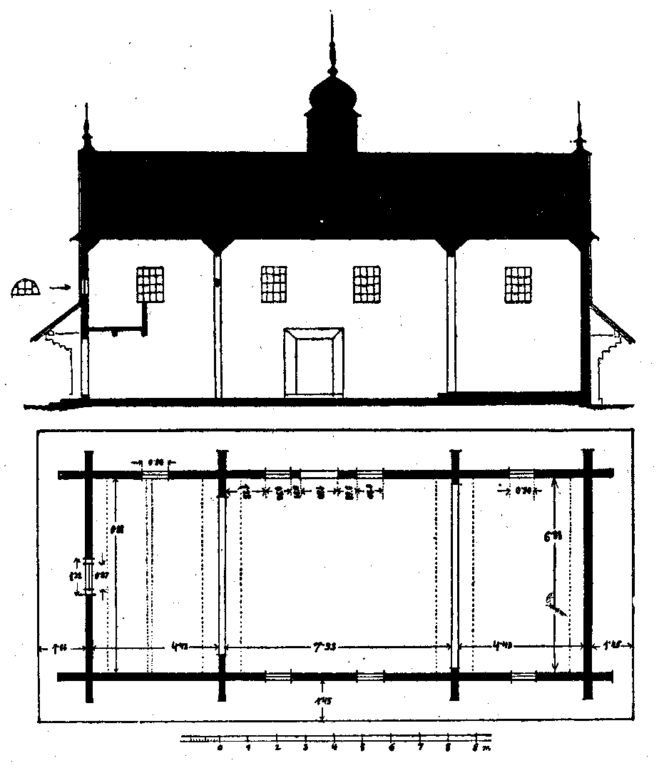 Поздовжній переріз і планРозмір зображення: 931:1077 піксел Церква 1847 р. (дерев.). Джерело: Драган М. Українські деревляні церкви. – Льв: 1937 р., т. 2, с. 39. |