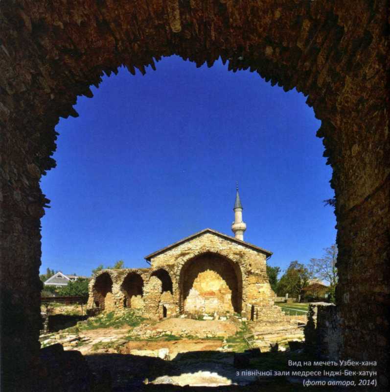 Вид на мечеть Узбека з північної зали медресе Інджі-Бек-хатун. Фото О. Гайворонського, 2014 р. [Гайворонський О. Країна Крим. – К.: Майстер книг, 2017 р., c. 8]