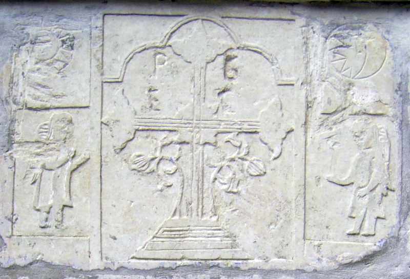 Різьблена плита з хрестом Розмір зображення: 800:545 піксел Вкладені елементи Рельєф сонця Лівий ангел Рельєф місяця Правий ангел Підніжжя хреста