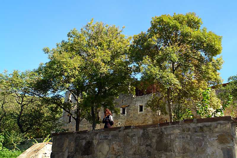 ТРАПЕЗНАЯ, XVI-XVIII вв. Находится на западной стороне большого двора. Прямоугольное здание, вытянутое с севера на юг, с пристройкой с южной стороны и надстройкой 60-х годов XIX в. над всем зданием. Сложено из бутового камня, надстройка из крупных каменных блоков. В трапезной два помещения с отдельными входами: северное – кухня-столовая и южное – несколько меньшее, неясного назначеция. Оба помещения перекрыты системой полуциркульных и сомкнутых сводов, лежащих на арках и стенах. Арки поддерживаются столбами прямоугольного сечения и пилястрами. В северной стене кухни устроен камин с топкой в форме полуциркульной арки, украшенной наличником, дымоход проложен в толще стены. Правее него – огромная печь с топкой такой же формы, но без наличника, перекрытая сводом и выступающая в виде параллелепипеда из объема трапезной. Печь могла служить не только для приготовления пищи, но и для копчения рыбы, мяса и как паровая баня. Вдоль всего западного фасада здания в цоколе устроен погреб в виде тоннеля, перекрытый сводом. Сохранились часть стен по периметру трапезной и металлический балкон на консолях с западной стороны памятника [Памятники градостроительства и архитектуры УССР. – К.: Будівельник, 1985 г., т. 2, с. 332).