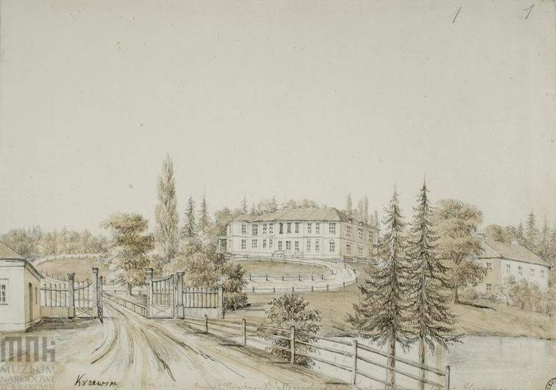 Pałac Hermanów dawniej Jabłonowskich. Widok od strony drogi dojazdowej. Pałac dwukondygnacjowy; z prawej strony oficyna. 1862 – 1876. Dat.: 18 Września. Napis: Krzewin; niegdyś X Władysława X. Jabłonowskiego żona Tyszkiewiczówna – teraz Hermana; napis na podkładzie: Wołyń. Krzewin. Rys. ołówkiem podmalowany sepią, 20,5x28,8. III-r.a. 4180 (Teka Wołyń) [Katalog rysunków architektonicznych ze zbiorów Muzeum narodowego w Krakowie. 1. Rysunki Napoleona Ordy / Opracowały Zofia Kucielska i Zofia Tobiaszowa. – Warszawa: Państwowe wydawnictwo naukowe, 1975, Nr. 361]