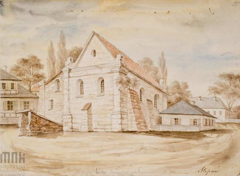 Synagoga. Widok ściany szczytowej i elewacji bocznej. Budynek kamienny, oskarpowany, kryty dwuspadowym dachem, z lewej strony przybudówka (?) z dachem pulpitowym. 1862- 1876, Dat.: 13 Września Stepań. Napis: Synagoga bardzo Starożytna w Stepaniu; napis na podkładzie: Wołyń Stepań,—Kościół paraf. [dwa ostatnie słowa skreślone]. Rys. ołówkiem podmalowany akwarelą i sepią, 19,9x27,1. III-r.a. 4263 (Teka Wołyń). Bibl.: Kaczanowska, Napoleon Orda, s. 123, ii. 5. (błędnie podano numer inwentarza). [Katalog rysunków architektonicznych ze zbiorów Muzeum narodowego w Krakowie. 1. Rysunki Napoleona Ordy / Opracowały Zofia Kucielska i Zofia Tobiaszowa. – Warszawa: Państwowe wydawnictwo naukowe, 1975, Nr. 691. Цілком неясно, чому автори каталогу називають цю будівлю синагогою. Це типовий кстел.]