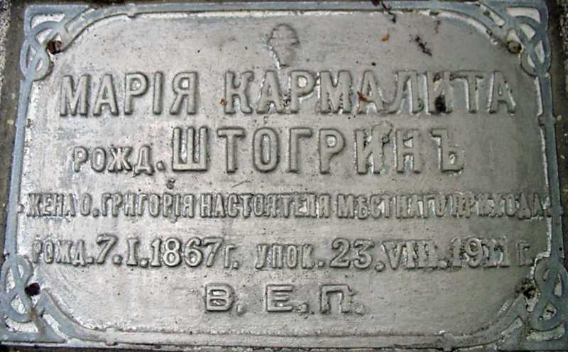 Напис: «Мария Кармалита рожд. Штогрин, жена о. Григория, настоятеля местого приходва. Рожд. 7.01.1867 г., упок. 23.08.1911 г. В[ечная] Е[й] П[амять]».