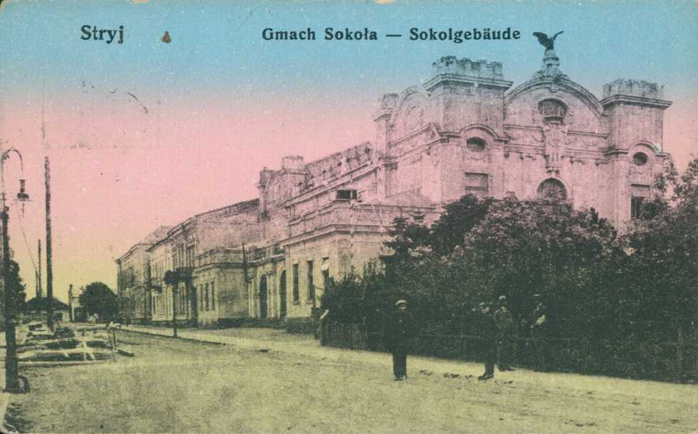 Поштівка: будинок польського спортивного товариства «Сокіл» у Стрию. Stryj, gmach Sokoła = Sokolgebäude. – [Wiedeń] : A. F. W., [1916] (pocztówka) : dr. barw. ; 8,8 × 14 cm