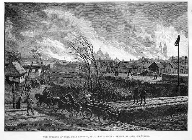 1886 р. Пожежа в м.Стрий Розмір зображення: 650:476 піксел Ілюстрація до статті в London News: Попередня сторінка | Вище | Наступна сторінка