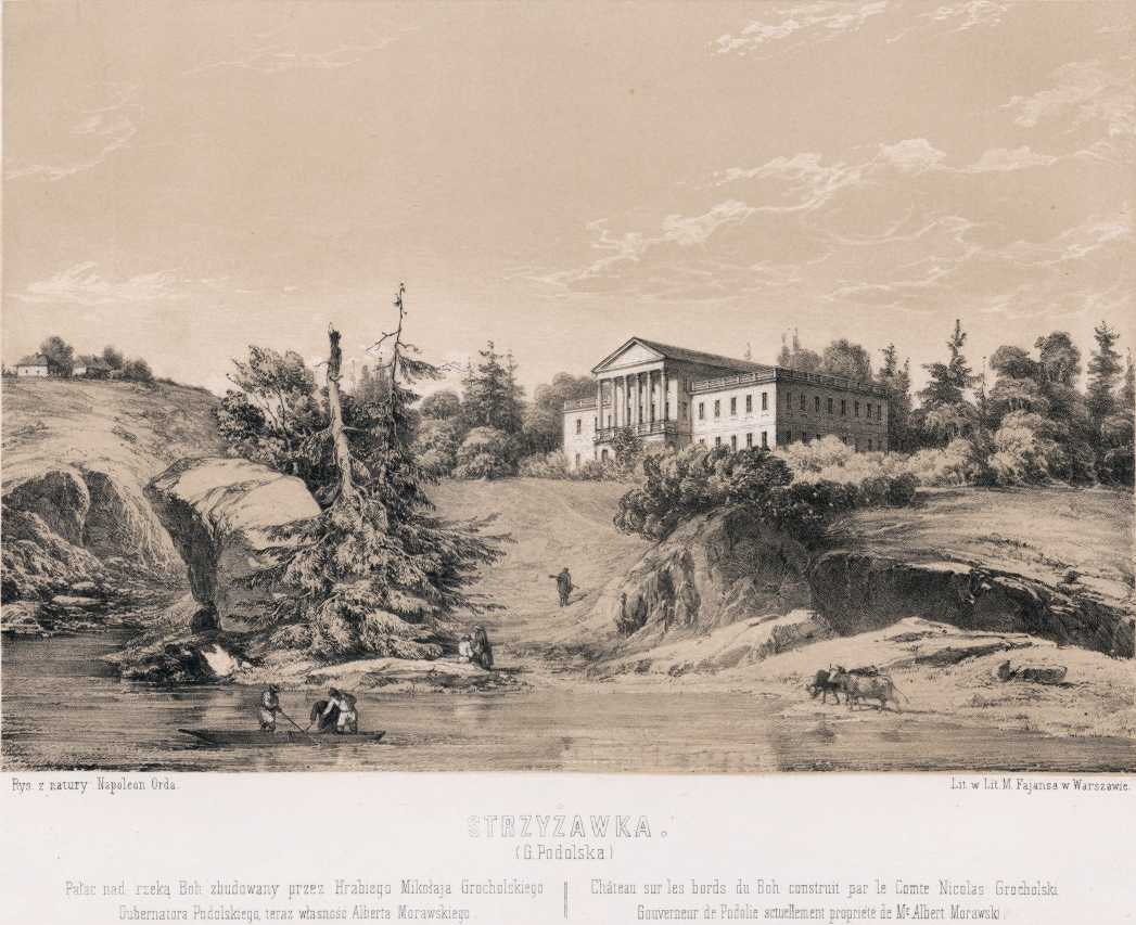 Підпис: палац, збудований подільським губернатором графом Міхалом Грохольським над р. Бог, нині власність Альберта Моравського.