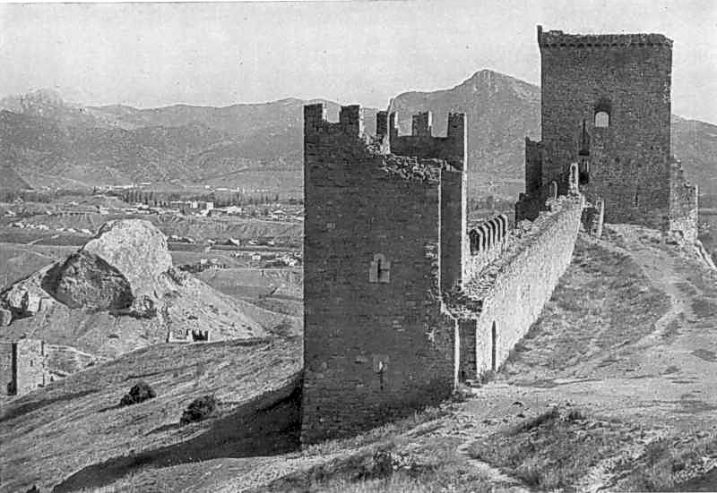 [1967 р.] Георгіївська та Консульська башти. Вигляд із заходуРозмір зображення: 800:551 піксел Судак. Фортеця XIII – XV ст. Джерело: Історія українського мистецтва. – К.: Наукова думка, 1967 р., т. 2, с. 52. |