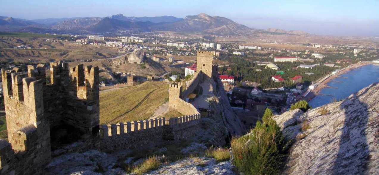 2004 р. Панорама верхнього ярусу оборони із заходу Розмір зображення: 1273:589 піксел Вкладені елементи Башта № 1 і цитадель на тлі Судацької долини (+) Цитадель і бухта