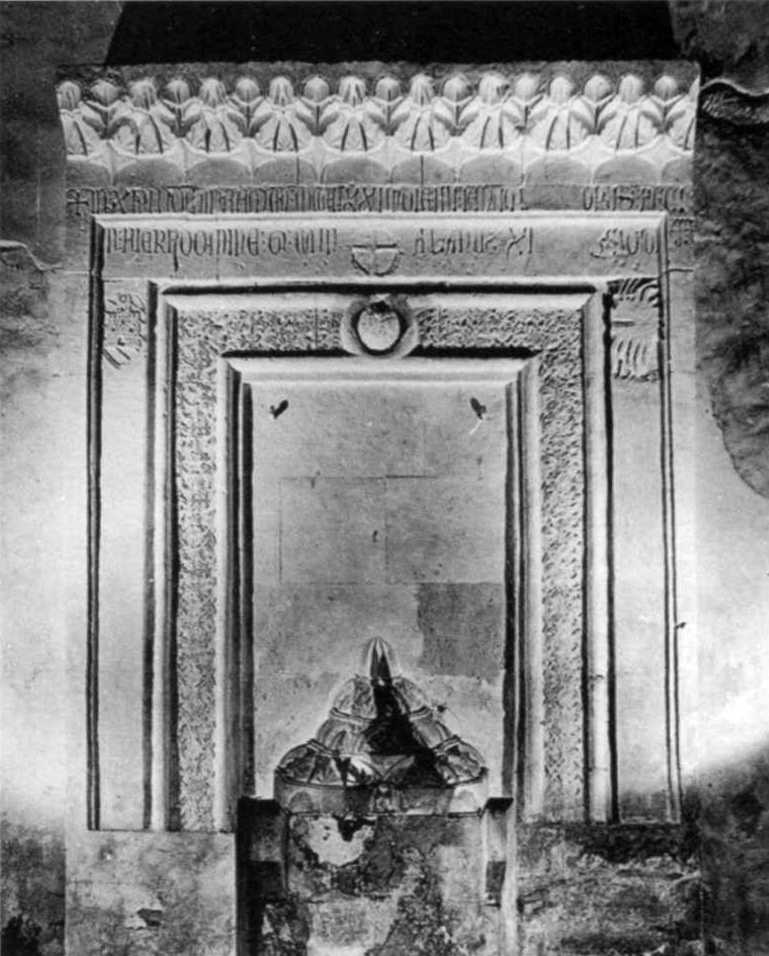 У центрі напису висічено хрест у колі, а по боках — смугастий щит із зображенням замку з трьома вежами (герб Генуезького роду Ґоано) і голова лева у профіль (напевно, теж герб, але поки що невідомо, чий саме).