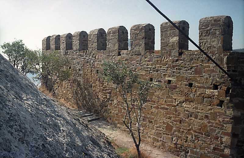 2001 р. Фрагмент муру на захід від башти № 2. Вигляд з південного сходуРозмір зображення: 800:517 піксел 2001 р. 24 вересня. Фото М.І.Жарких. Негатека, № 941-27. |