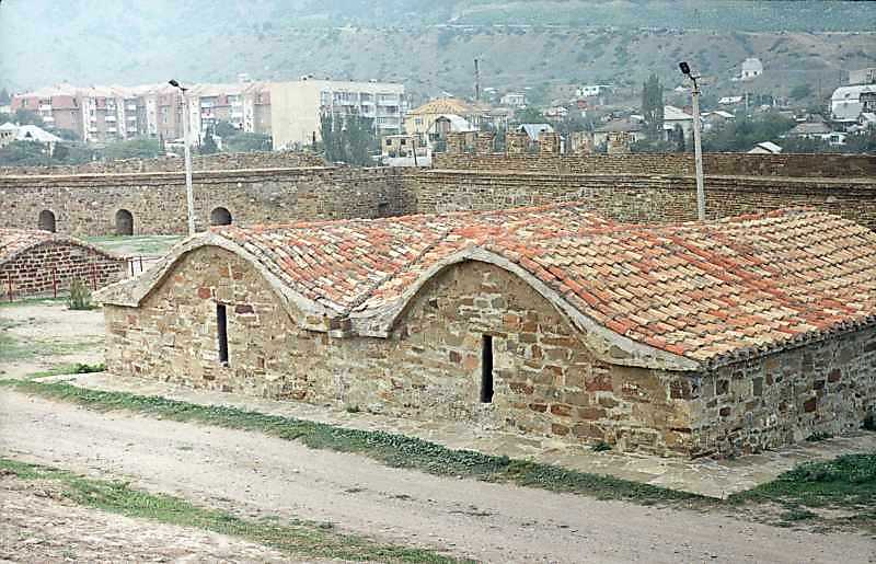 Складська споруда № 1, що датується XIV-XV ст., розташована біля башти Пасквале Джудіче. Споруда мурована з вапняку на вапняному розчині, прямокутна в плані (12,4:10,1 м), двокамерна, первісне триповерхова (збереглися гнізда балок). Підземна частина заглиблена на 5,4 м, висота наземної – 2,3 м. Два коробові склепіння спираються на простінок, розчленований двома високими стрілчастими арками. У причілках з одного боку споруди – бійниці, з другого – вхід. Будівля укрита черепицею по склепіннях. У період панування генуезців споруда, можливо, використовувалась як склад зброї та продовольства.