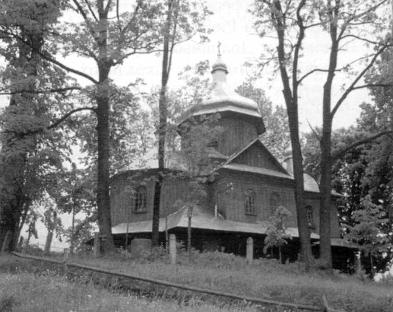 Дерев’яна церква неоукраїнського типу, зведена в 1903 році, ймовірно, за проектом архітекта Василя Нагірного. Це був хрещатий у плані храм з укороченими прямокутними бічними раменами, прямокутним бабинцем і гранчастим вівтарем. Обабіч при вівтарі містилися прямокутні ризниці, а до бабинця із заходу прилягав відкритий ґанок. Над навою здіймалася наметова баня на світловому восьмерикові, завершена ажуровим ліхтарем з маківкою. Бічні рамена й бабинець покривали двосхилі причілкові дахи з острішками, а вівтар – п’ятисхилий. Гребені дахів бабинця й вівтаря вінчали великі сліпі восьмибічні ліхтарі з маківками. Оперізувало споруду піддашшя, сперте на профільовані випусти вінців зрубів. Згоріла в серпні 2003 року.