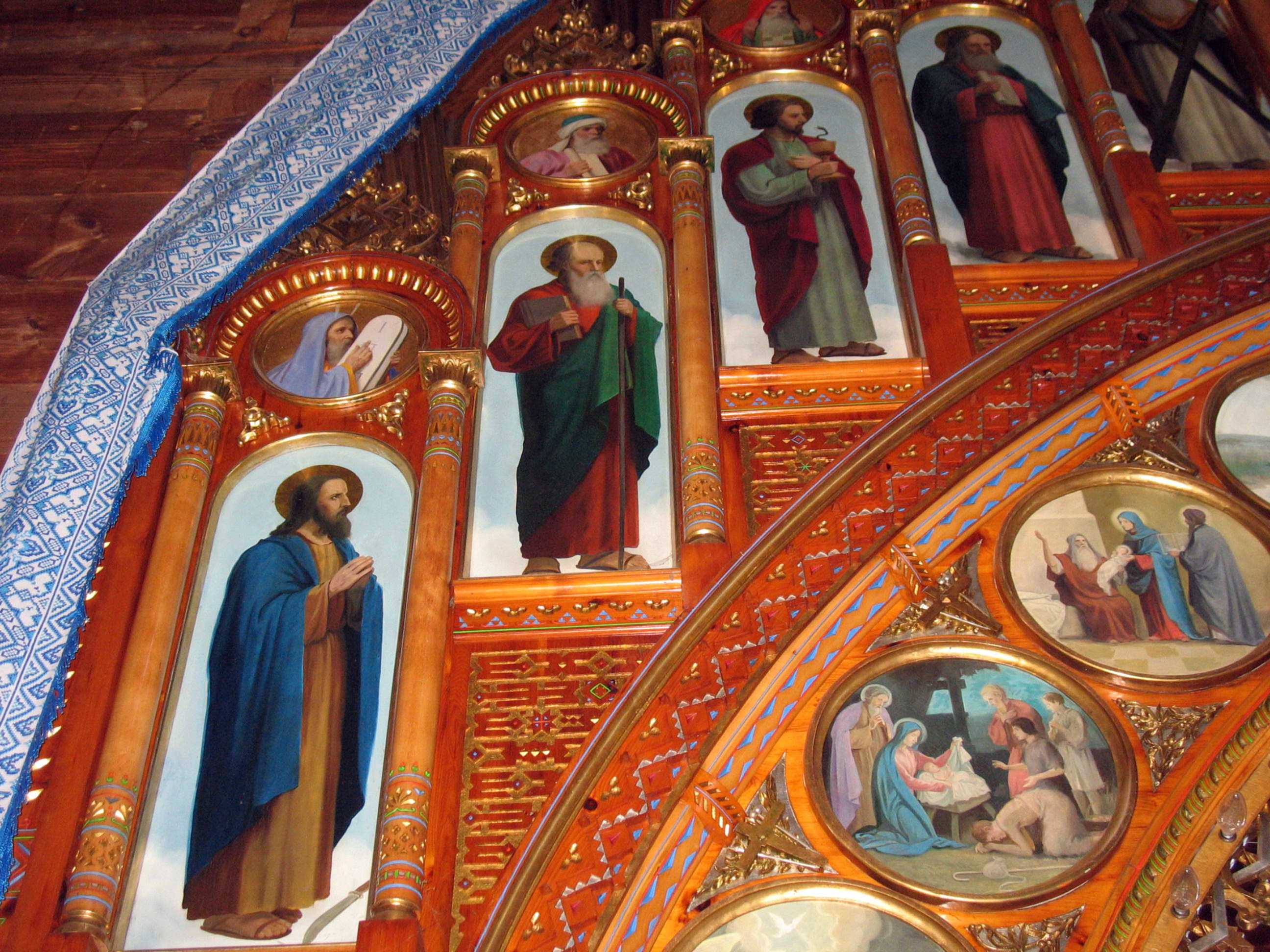 Ліва частина іконостаса (2)Розмір зображення: 2592:1944 піксел Фото Зенона Боровця і Богдана Тхора, 13 серпня 2008 р. У празниковому ряду – Поклоніння волхвів, Стрітення. |