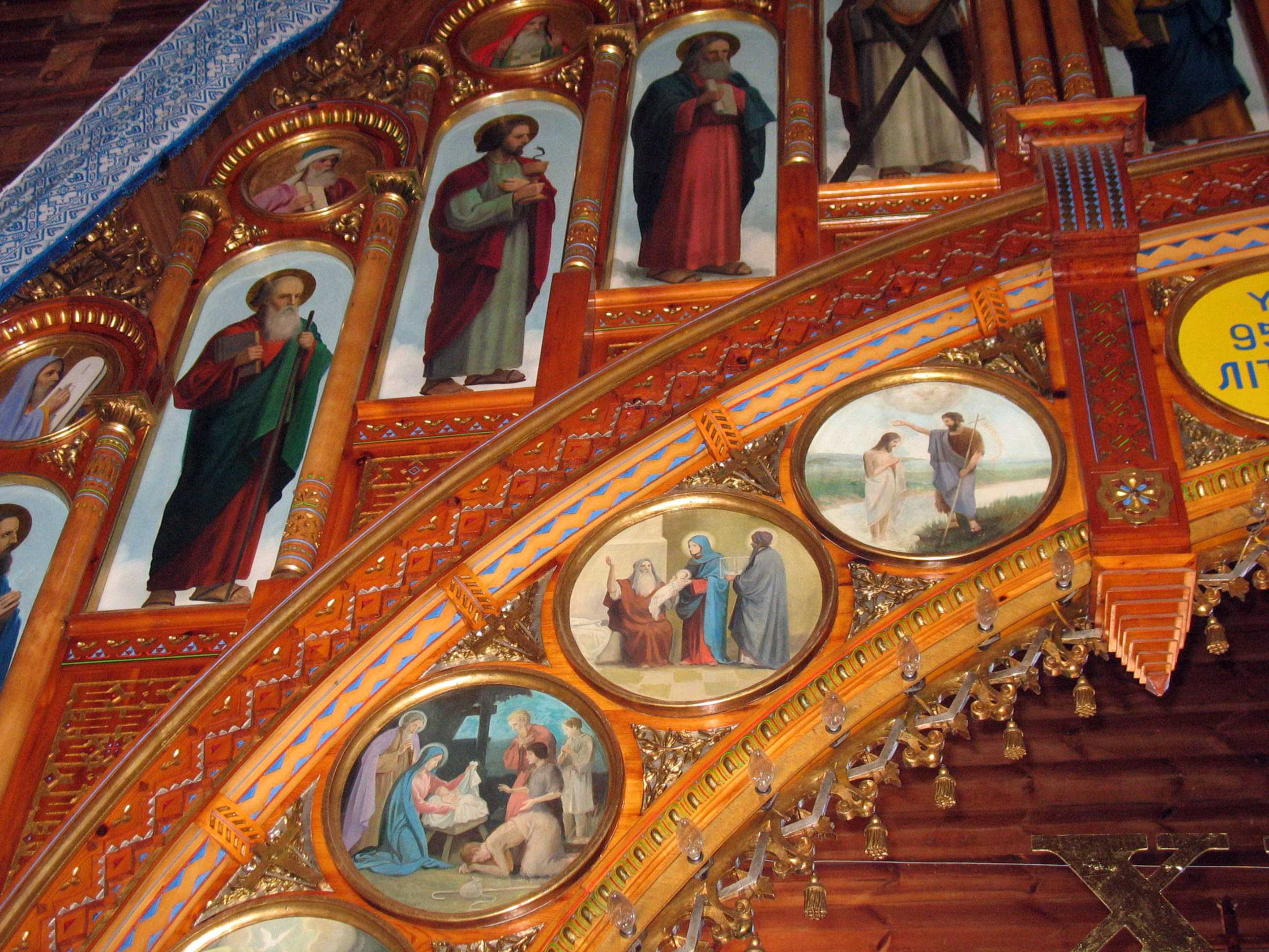 Ліва частина іконостаса (пророчий, апостольський, празниковий ряди)Розмір зображення: 2592:1944 піксел Фото Зенона Боровця і Богдана Тхора, 13 серпня 2008 р. У празниковому ряду – Поклоніння волхвів, Стрітення, Хрещення. |