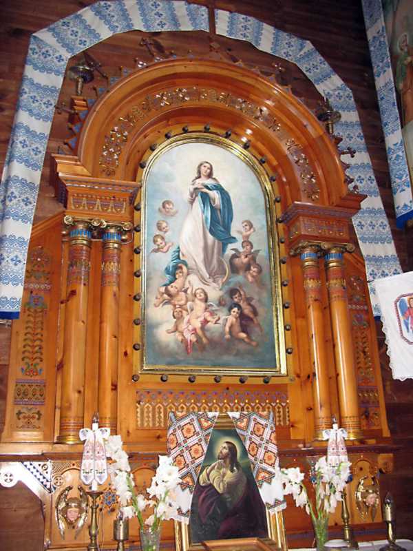 Кіот з іконою «Непорочне зачаття»Розмір зображення: 600:800 піксел Фото Зенона Боровця і Богдана Тхора, 13 серпня 2008 р. Кіот знаходиться у правому рамені трансепту, праворуч від іконостасу. |
