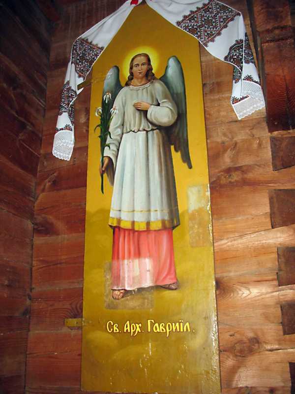 Ікона «Архангел Гавриїл»Розмір зображення: 600:800 піксел Фото Зенона Боровця і Богдана Тхора, 13 серпня 2008 р. Ікона знаходиться під торцем хорів. Від входу це буде правий бік. |