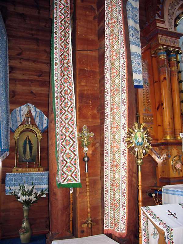 2008 р. Фрагмент інтер’єра навиРозмір зображення: 600:800 піксел Фото Зенона Боровця і Богдана Тхора, 13 серпня 2008 р. Сам фрагмент показує стіну нави праворуч від іконостасуа. Ліворуч на фото – ікона «Непорочне зачаття». |