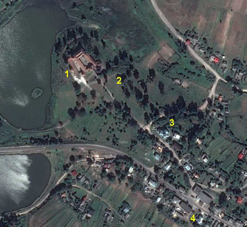 Космічне фото YandexРозмір зображення: 850:781 піксел Космічне фото Yandex 1 – замок; 2 – башта; 3 – костел Успіння; 4 – церква Покрови. |