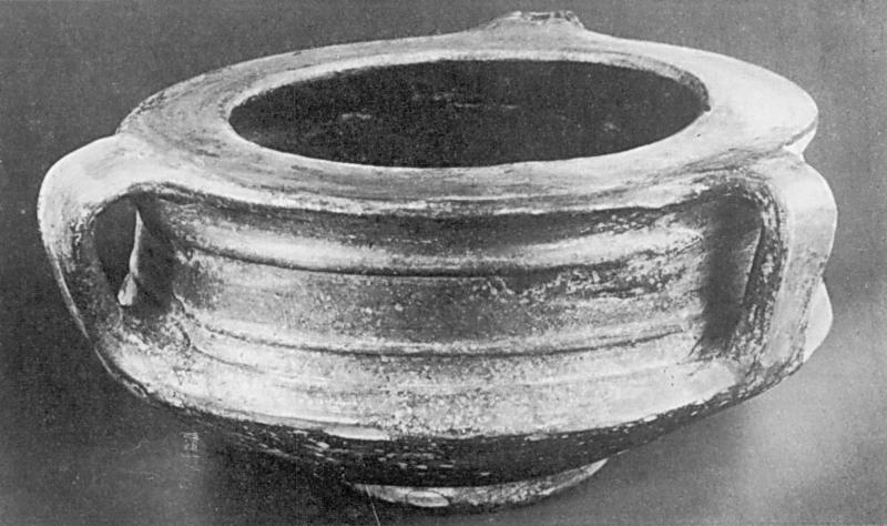 Серолощеный сосуд биконической формы выполнен на гончарном круге. Венчик широкий горизонтальный, от которого отходят три плоские ручки Верхняя часть сосуда расчленена горизонтальными полосами, орнаментированными проложенными линиями.