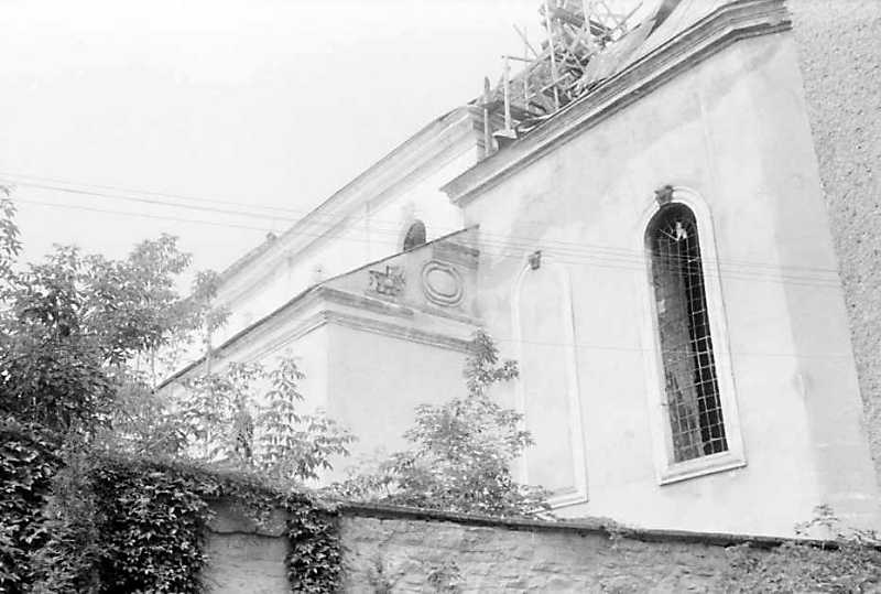 1989 р. Фрагмент бічного фасаду. Вигляд з позиції А2Розмір зображення: 800:539 піксел 1989 р. 13 серпня. Фото М.І.Жарких. Негатека, № 556-35. |