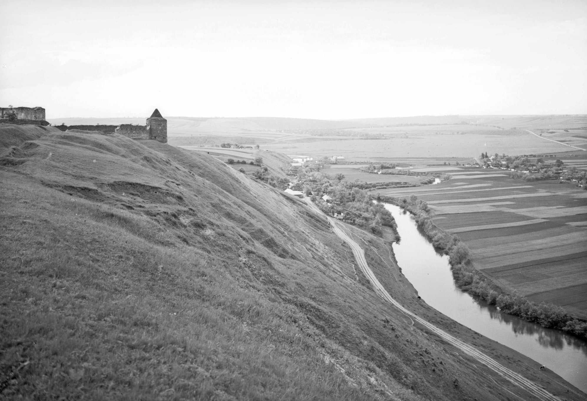 Церква 2 та південно-західна башта 4, праворуч – схил до Серета. Церква стоїть без даху і без ліхтарика, видного на фото 1914 р. з тієї самої точки.