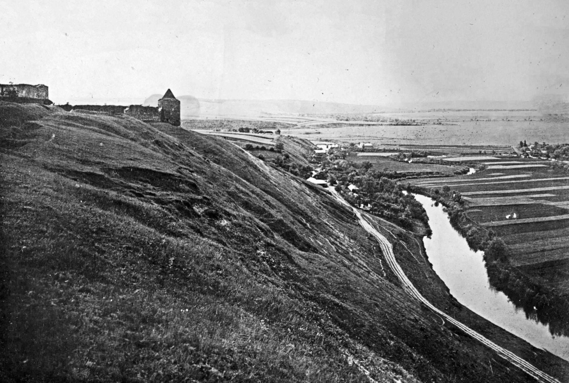 1939 р. Вигляд з півночіРозмір зображення: 1998:1343 піксел Фото 1939 р. опубліковано на сторінці «Мандрівка старим кордоном» 7.02.2022 р. Церква 2 та південно-західна башта 4, праворуч – схил до Серета. |