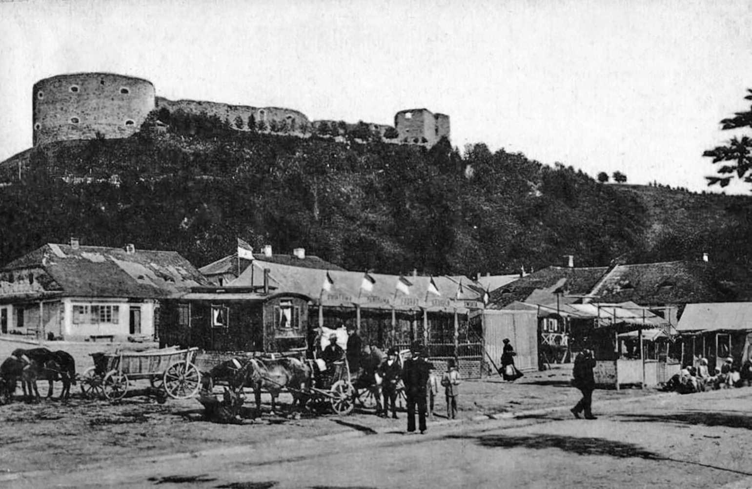 Після фото з руїнами з кінця 1-ї світової війни маємо оце фото – уже відбудова, на площі перед будинками – якісь тимчасові (?) торговельні приміщення, а найголовніше – дерева на горі вищі (на фото 1890 р. їх взагалі нема).