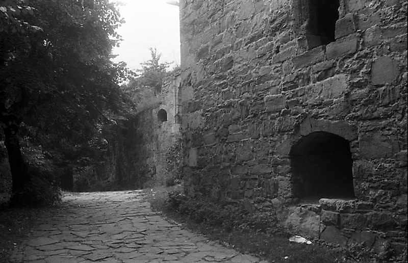 1989 р. Фрагмент муру 2 і башти 8Розмір зображення: 800:516 піксел Вигляд з півночі. 1989 р. 13 серпня. Фото М.І.Жарких. Негатека, № 558-12. |