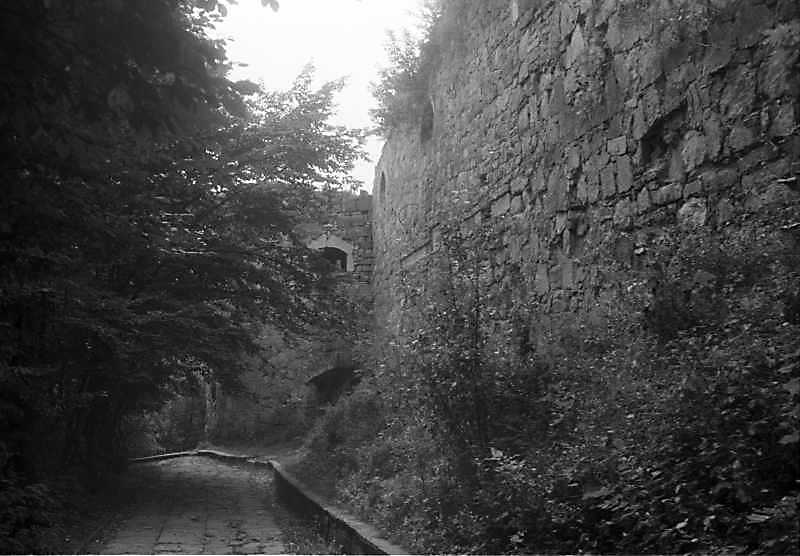 1989 р. Південна башта 3 і фрагмент східного муру 2Розмір зображення: 800:556 піксел Вигляд з півночі. 1989 р. 13 серпня. Фото М.І.Жарких. Негатека, № 558-34. |