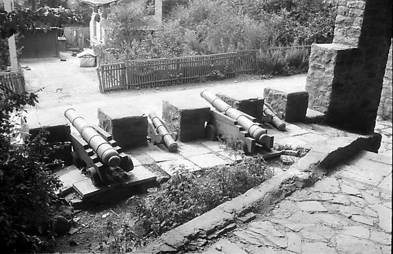 1989 р. Гармати на вулиці біля підйому до замкуРозмір зображення: 800:518 піксел 1989 р. 13 серпня. Фото М.І.Жарких. Негатека, № 558-36. |