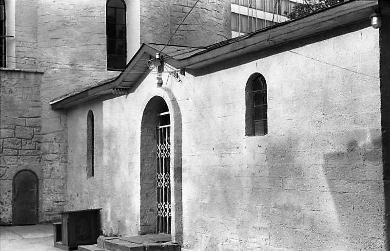1988 р. Фрагмент південного фасаду і мур огорожі. Вигляд з південного заходуРозмір зображення: 800:516 піксел 1988 р. 26 червня. Фото М.І.Жарких. Негатека, № 434-05. |