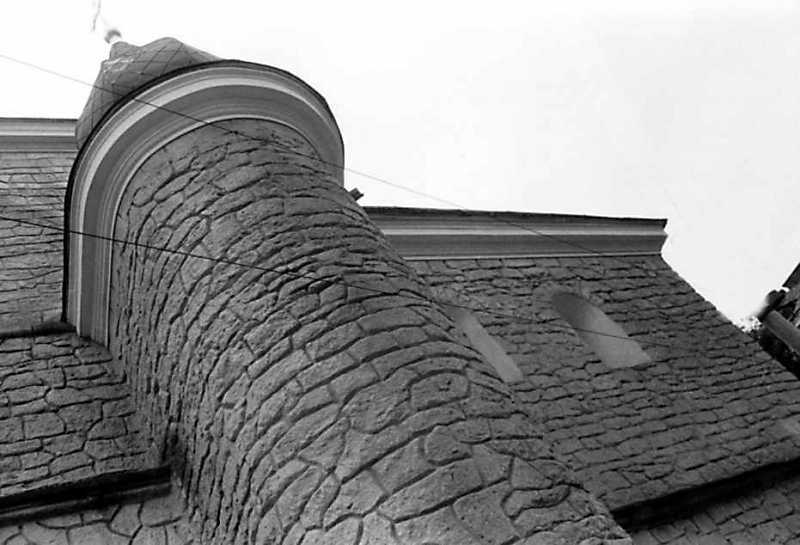 1991 р. Фрагмент північного фасаду в ракурсі. Вигляд з півночіРозмір зображення: 800:545 піксел 1991 р. 21 серпня. Фото М.І.Жарких. Негатека, № 736-20. |