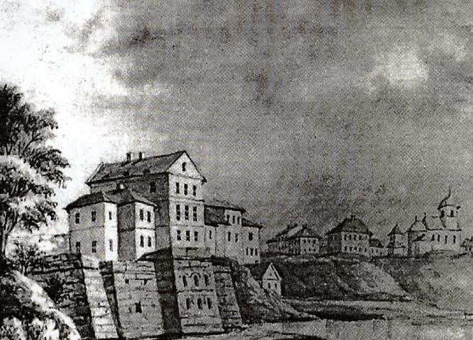 Zamek Tarnowskich i cerkiew p.w. Podwyższenia krzyża św. i Uśpienia NMP. Widok ogólny od strony stawu. Z lewej strony w obrębie fortyfikacji bastionowych dwukondygnacjowy zamek z trzykondygnacjową częścią środkową; z prawej strony cerkiew z wyodrębnionym prezbiterium i z kopułą na wysokim bębnie. 1878—1880. Dat.: 1879. Napis: Tarnopol; napis na podkładzie: Galicya. Rys. ołówkiem podmalowany akwarelą, 22,8x28,6. III-r.a. 4587 (Teka Różnych Krajów). Bibl.: Kaczanowska, Napoleon Orda, s. 147. [Katalog rysunków architektonicznych ze zbiorów Muzeum narodowego w Krakowie. 1. Rysunki Napoleona Ordy / Opracowały Zofia Kucielska i Zofia Tobiaszowa. – Warszawa: Państwowe wydawnictwo naukowe, 1975, Nr. 728]