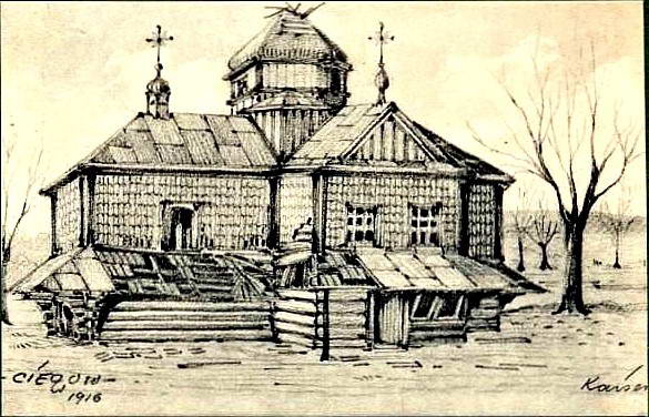 Одноверха дерев’яна церква, зведена 1854 року, зображена зі знищеною банею, розбитими вікнами і пообдираним піддашшям. В подальшому перебігу воєнних дій вона була знищена повністю. На її місці спочатку збудували тимчасову каплицю, а в 1938 році – нову дерев’яну церкву.