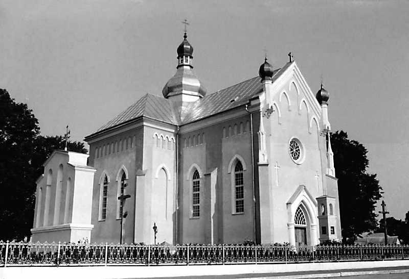 1990 р. Дзвіниця і костел. Вигляд з позиції А4Розмір зображення: 800:547 піксел 1990 р. 16 серпня. Фото М.І.Жарких. Негатека, № 663-38. |