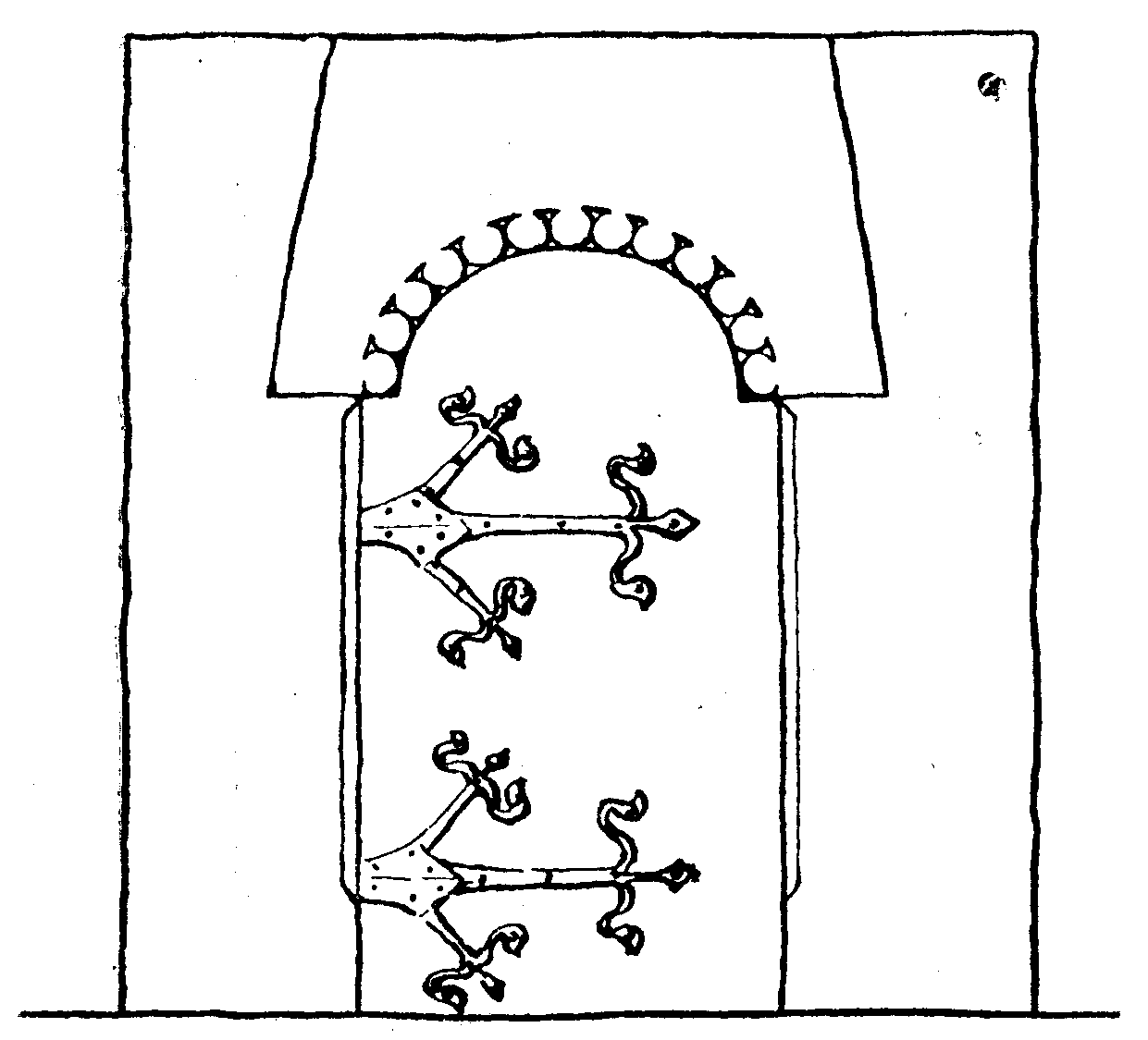 Двері ц-ви в Торках біля ПеремишляРозмір зображення: 1241:1125 піксел Джерело: Січинський В. Деревяні дзвіниці і церкви Галицької України XVI – XIX ст. – Льв.: 1925 р., № 87. |