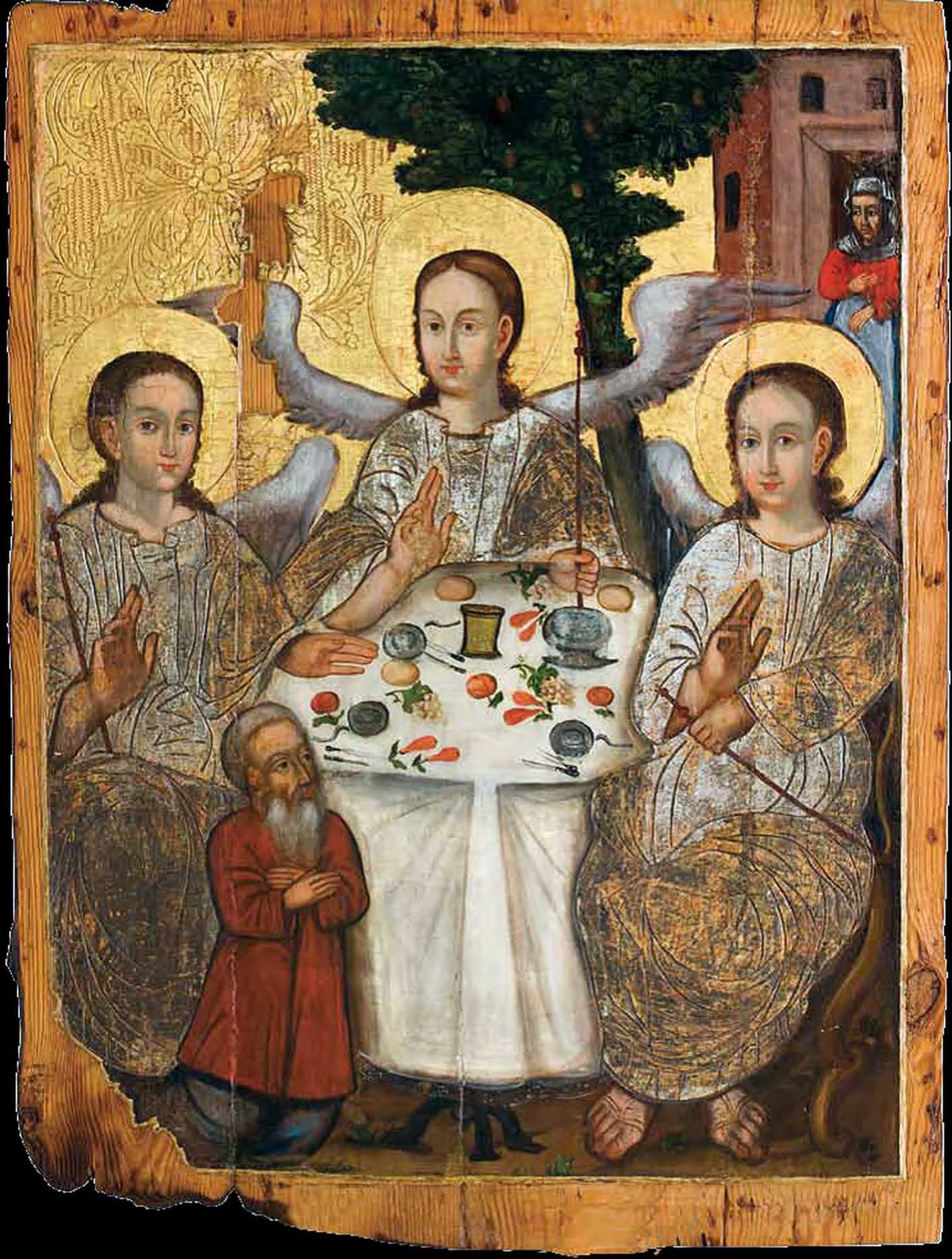 Ангели, маючи досить масивні фігури, просто домінують над постатями Авраама і Сарри, яких автор розміщує на діагоналі, пересікаючи їхні погляди на гостях. Цікаво, що Авраам і Сарра подаються як істинно віруючі люди: рука Сарри притулена до грудей, Авраам стоїть навколішки перед столом і складеними на грудях руками проявляє повагу гостям. Народного колориту іконі надають світські одежі персонажів: Авраам у червоній свиті і синіх штанах, Сарра – у червоній сорочці, поверх синьої спідниці білий фартух, на голові білий плат. Лики Авраама і Сарри наділені рисами старших людей – сиві волосся і борода у Авраама, зморшки на щоках і чолі Сарри. Майже круглої форми стіл на трьох фігурних ніжках підкреслює ідею єдності і рівноправ’я гостей Авраама, а білого кольору скатертина наголошує на чистоті їхніх помислів.