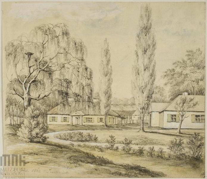 Dwór Płotnickich. Widok od strony podjazdu. Dwór o zróżnicowanej bryle z gankiem i werandą. 1862. Dat:. 26 Grud. 1862. Napis: Trosteniec; napis na podkładzie: G. Wołyńska Trosteniec, – — dwór. Rys. ołówkiem podmalowany akwarelą, 20,6x23,8. III-r.a. 4274 (Teka Wołyń). [Katalog rysunków architektonicznych ze zbiorów Muzeum narodowego w Krakowie. 1. Rysunki Napoleona Ordy / Opracowały Zofia Kucielska i Zofia Tobiaszowa. – Warszawa: Państwowe wydawnictwo naukowe, 1975, Nr. 749]