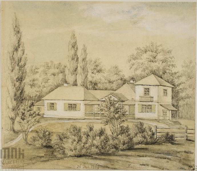 Dwór Płotnickich. Widok parterowych zabudowań dworskich; z prawej strony fragment dworu. 1862. Dat.: 27 Grud. 1862 Trosteniec. Napis na podkładzie: G. Wołyńska Trosteniec, – dwór. Rys. ołówkiem podmalowany akwarelą, 20,6x23,8. III-r.a. 4275 (Teka Wołyń). [Katalog rysunków architektonicznych ze zbiorów Muzeum narodowego w Krakowie. 1. Rysunki Napoleona Ordy / Opracowały Zofia Kucielska i Zofia Tobiaszowa. – Warszawa: Państwowe wydawnictwo naukowe, 1975, Nr. 750]