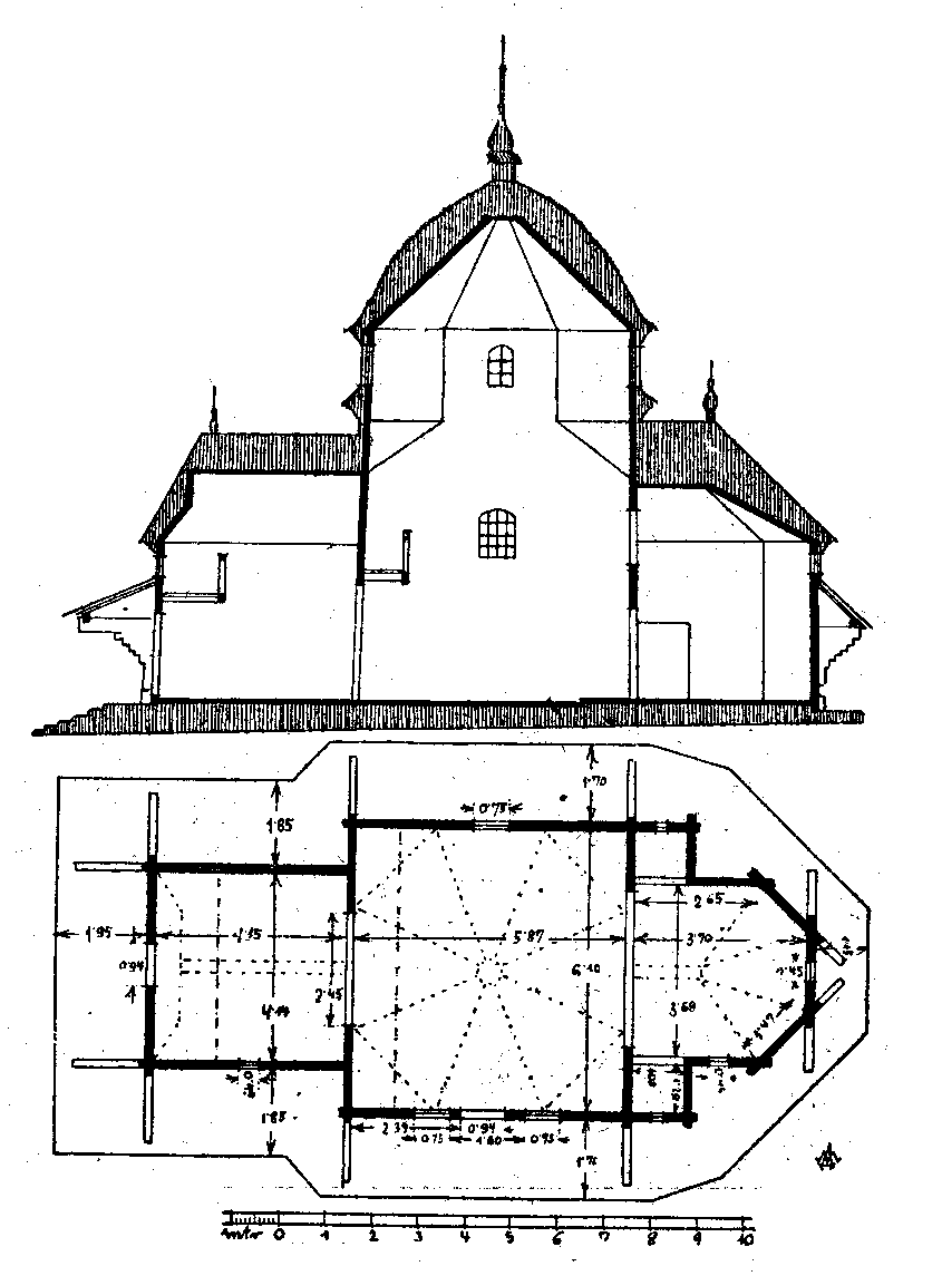 Поздовжній переріз і планРозмір зображення: 845:1145 піксел Джерело: Драган М. Українські деревляні церкви. – Льв..: 1937 р., т. 2, с. 115. |