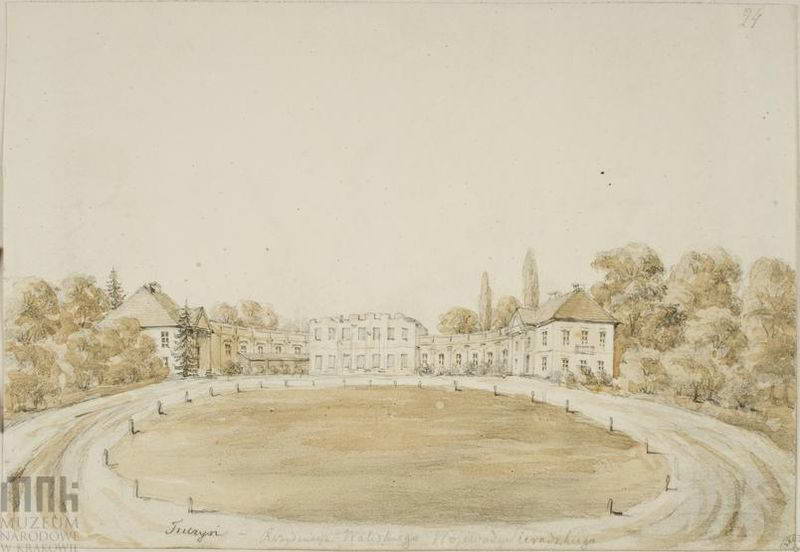 Pałac Walewskich. Widok od strony podjazdu. Korpus pałacu (w ruinie) połączony z dwukondygnacjbwymi oficynami ćwierćkolistymi galeriami. 1862—1876. Napis: Tuczyn – Rezydencya Waleskiego Wojewody Sieradzkiego; napis na podkładzie: Tuczyn, – pałac Wołyń. Rys. ołówkiem podmalowany sepią, 20,3 x 29,4. III-r.a. 4276 (Teka Wołyń). Bibl.: Aftanazy, Architekt Merk, s. 458—459, il. po s. 464; Jaroszewski, O dwóch grupach polskich rezydencji, il. 32. [Katalog rysunków architektonicznych ze zbiorów Muzeum narodowego w Krakowie. 1. Rysunki Napoleona Ordy / Opracowały Zofia Kucielska i Zofia Tobiaszowa. – Warszawa: Państwowe wydawnictwo naukowe, 1975, Nr. 753]