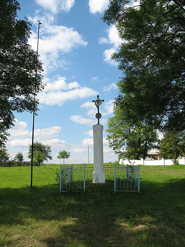 Пам’ятний (?) хрестРозмір зображення: 600:800 піксел Фото Зенона Боровця і Богдана Тхора, 5 серпня 2011 р. Праворуч – паркан довкола церкви та дзвіниця. |