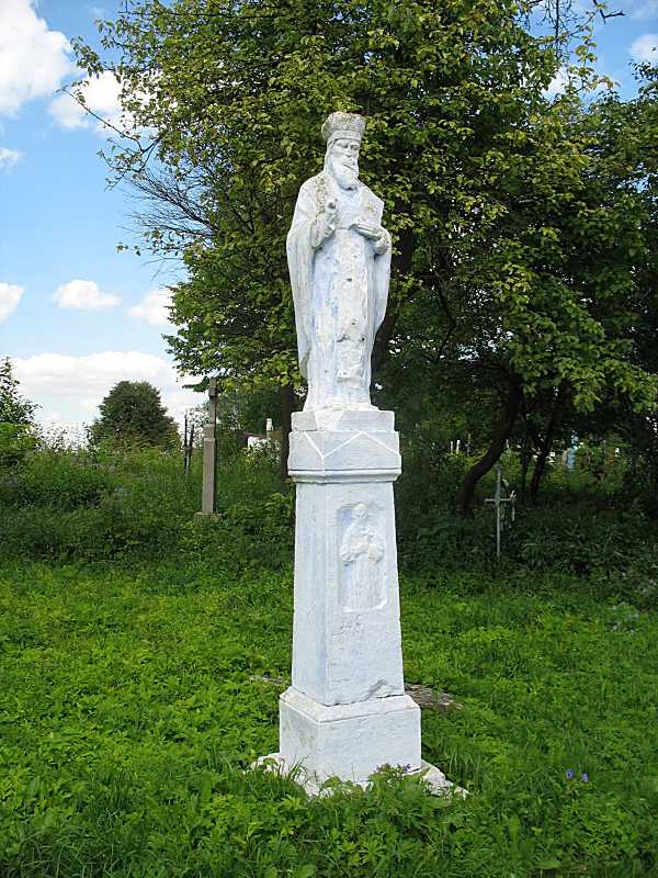 Надгробок зі скульптурою св. МиколаяРозмір зображення: 600:800 піксел Фото Зенона Боровця і Богдана Тхора, 5 серпня 2011 р. |
