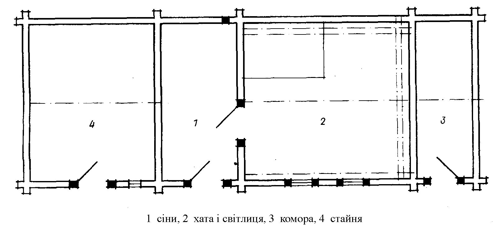 1 – сіни, 2 – хата і світлиця, 3 – комора, 4 – стайня.