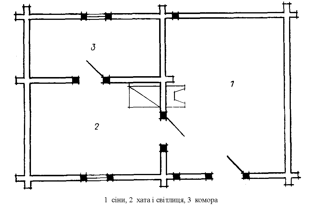 1 – сіни, 2 – хата і світлиця, 3 – комора, 4 – стайня.