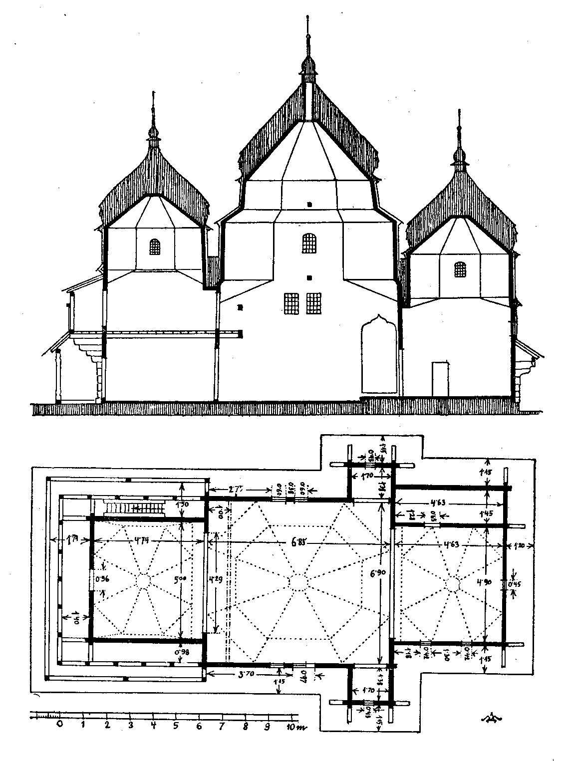 Поздовжній переріз і планРозмір зображення: 1126:1525 піксел Церква 1690 р. (дерев.). Джерело: Драган М. Українські деревляні церкви. – Льв.: 1937 р., т. 2, с. 62. |