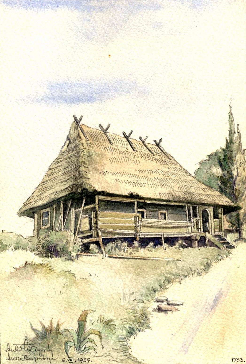 1939 р. Хата. Загальний виглядРозмір зображення: 1047:1548 піксел Рисунок Антона Вариводи (Краків), 6.08.1939 р. 1763 Dwelling, Tukhlya (Tuchla). Southwestern view. |