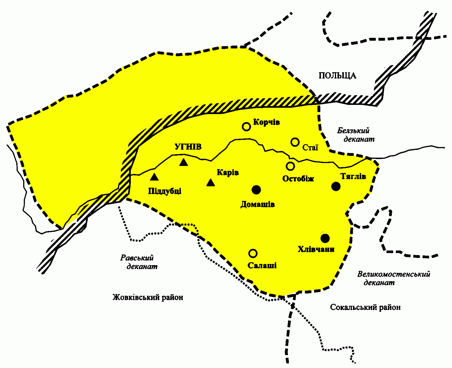 Картосхема української частини деканату за В.СлободяномРозмір зображення: 1579:1284 піксел Джерело: Слободян В. Церкви України: Перемиська єпархія. – Льв.: 1998 р., с. 699. |