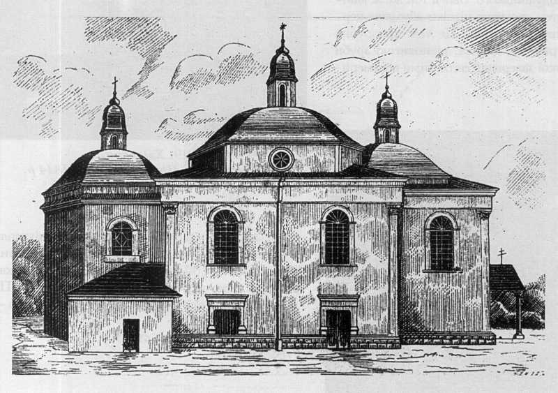 Угнів. Церква Різдва Пр. Богородиці, 1850-і pp. Реконструйована у 1893 р. Рисунок до реконструкції з «Місійна книжочка.», 1897, ч. 2.